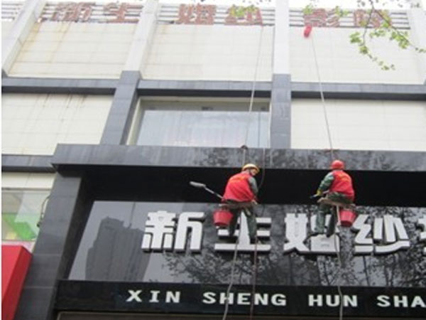 迪邦保潔公司人員正在為“新余新生婚紗攝影”做外墻清洗。