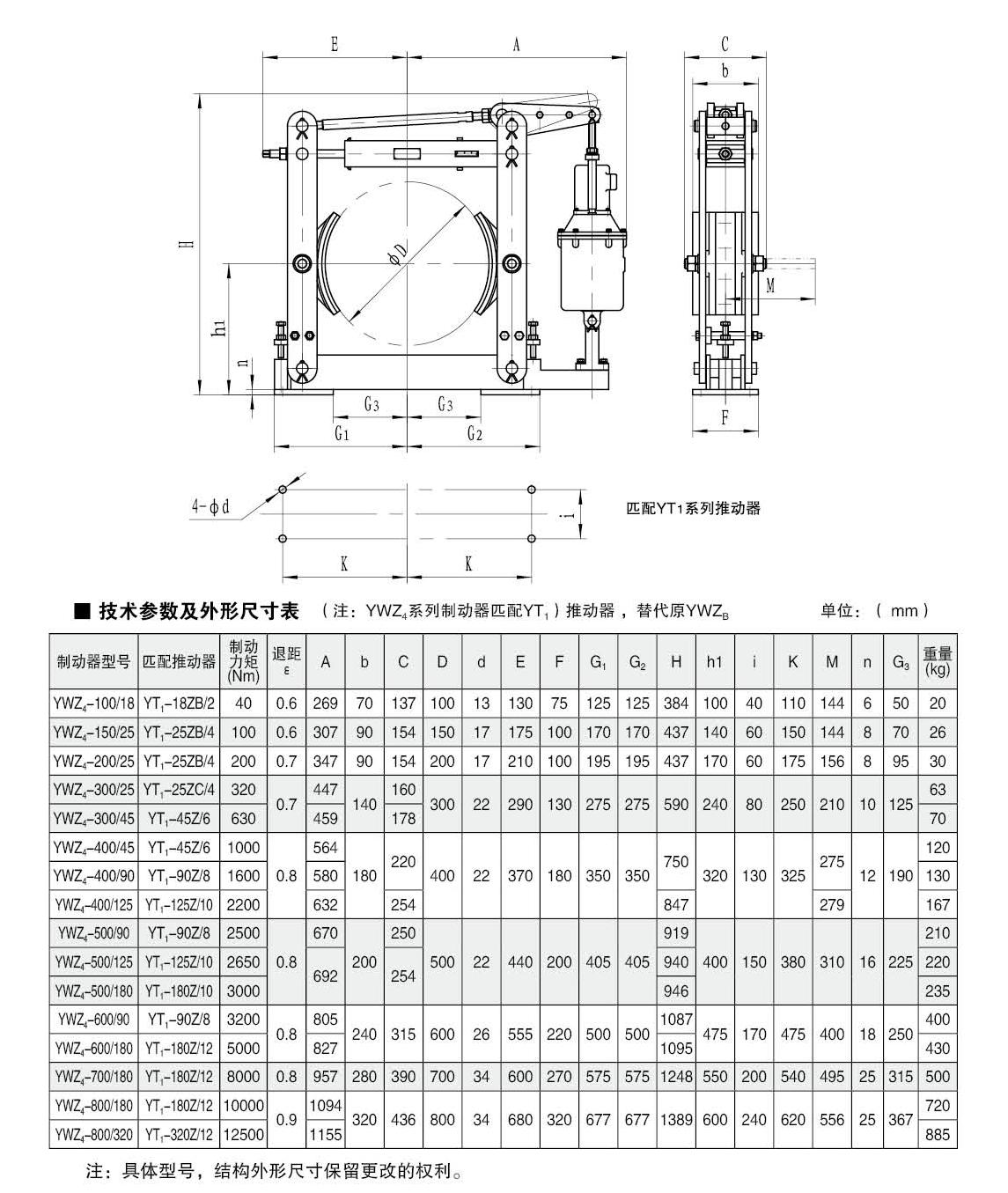 YWZ(YT1)系列電力液壓鼓式制動(dòng)器的連接尺寸和制動(dòng)力矩參數(shù)符合JB/ZQ4388-86標(biāo)準(zhǔn),技術(shù)要求符合JB / T6406-2006標(biāo)準(zhǔn)。